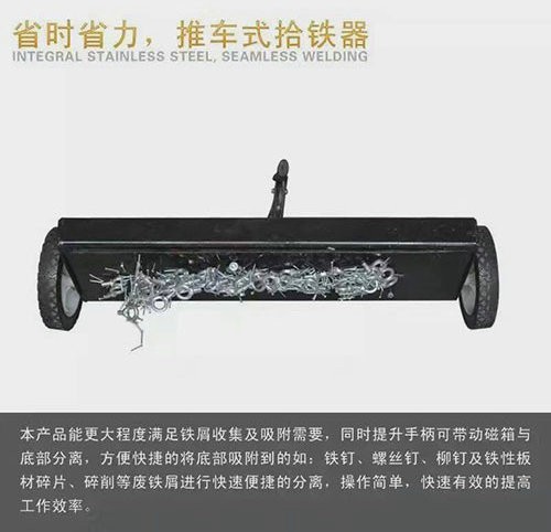 強磁吸鐵車可自動撿拾地麵鐵粉或鐵器物件。適用於機械加工廠、選礦廠、球團廠、燒結廠、鋼鐵廠,還可在沙灘、沙漠、選拾鐵礦石、鐵礦粉,總之使用廣泛,利國利民。